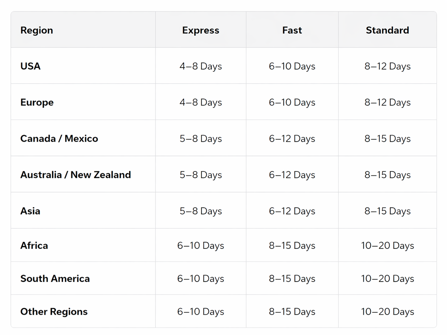 Delivery time is calculated in business days only.