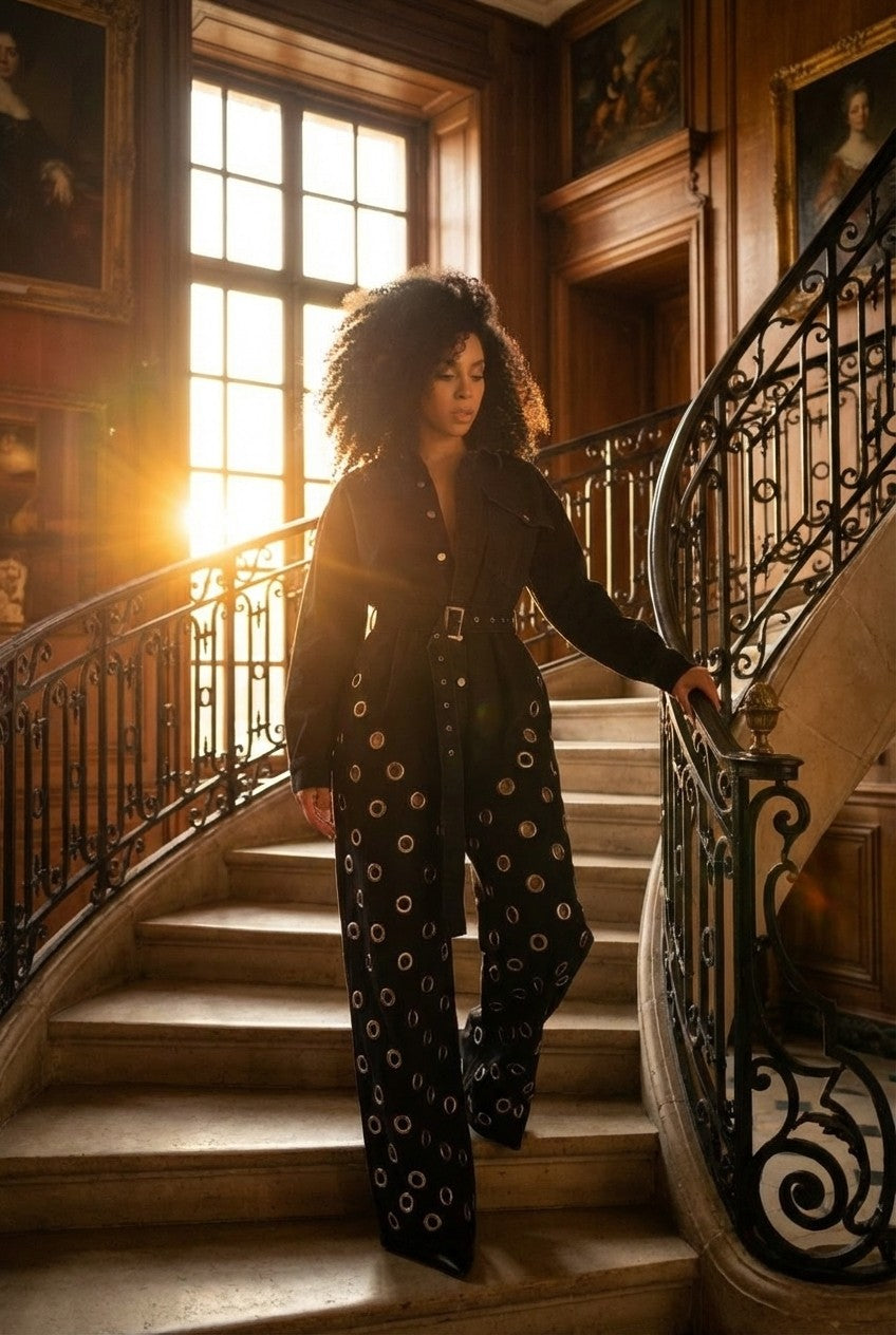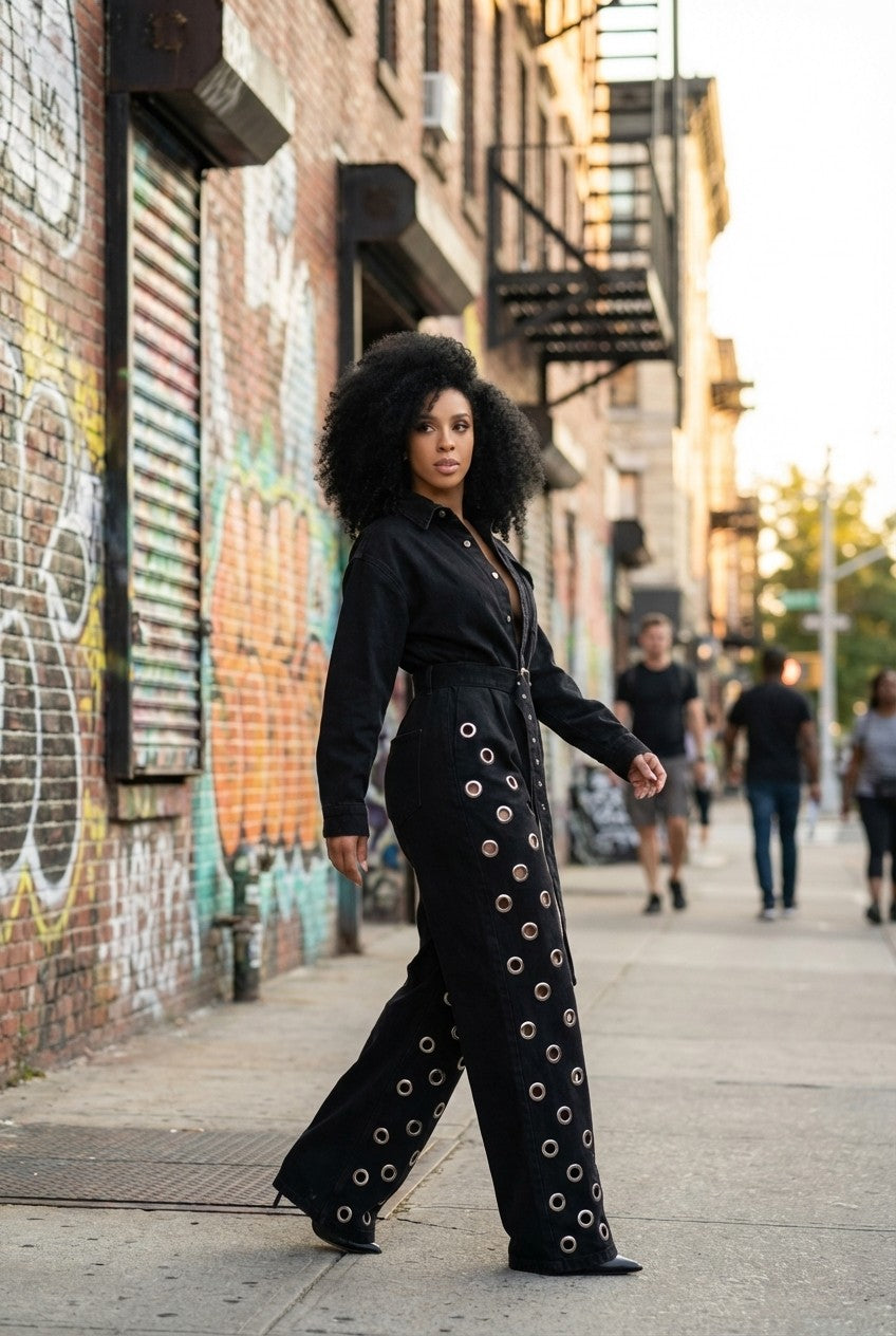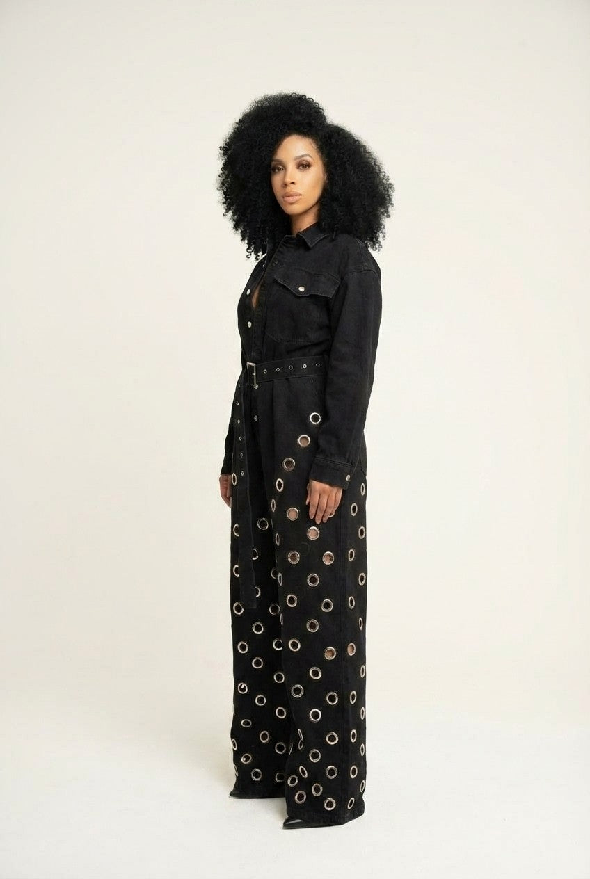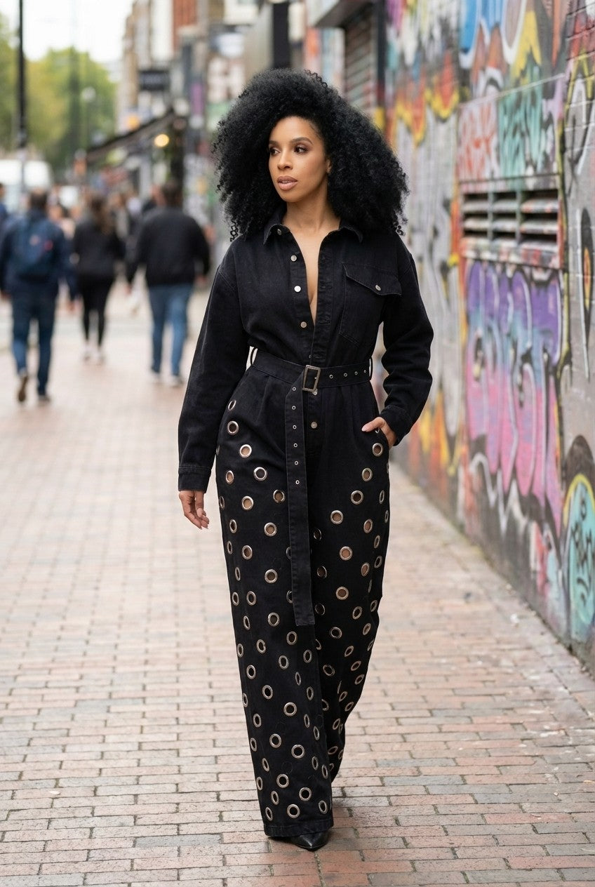 Bold and fashion-forward, this statement jumpsuit blends structured tailoring with eye-catching details for a standout look.