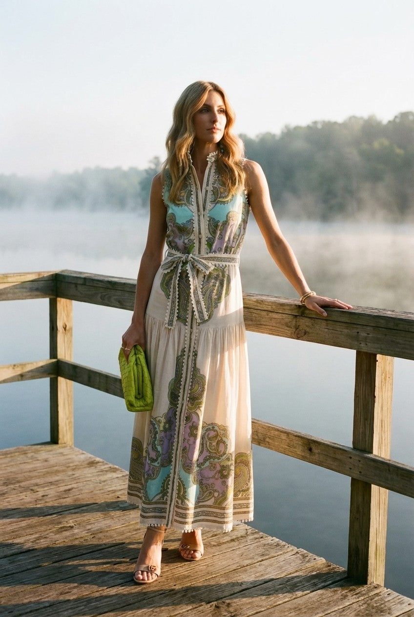 Elegant, airy, and effortlessly feminine—this sleeveless maxi dress features a soft paisley print with delicate detailing for a timeless bohemian look.