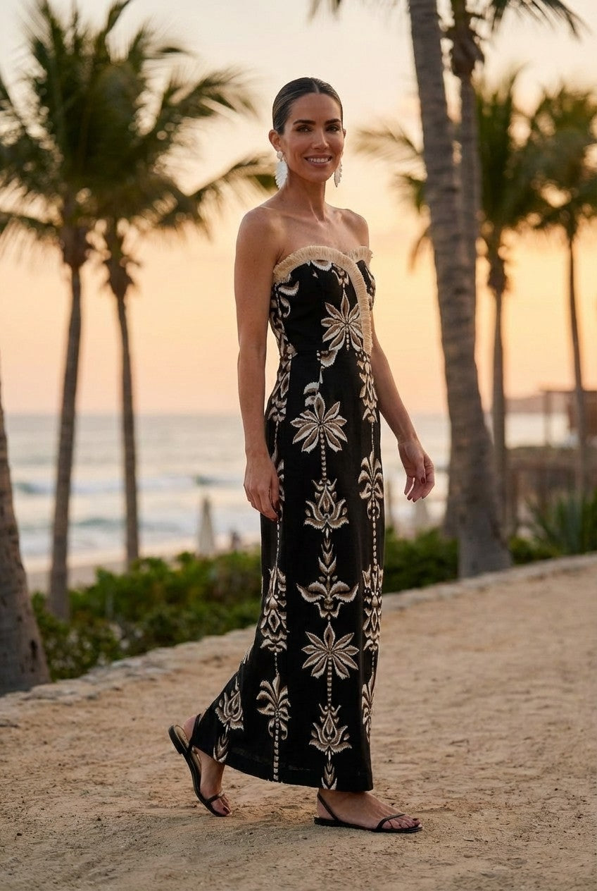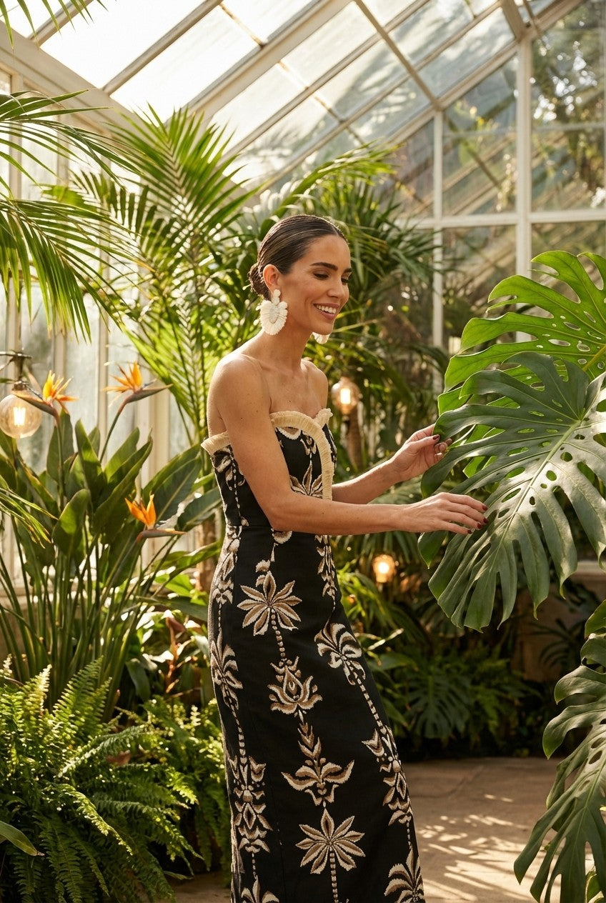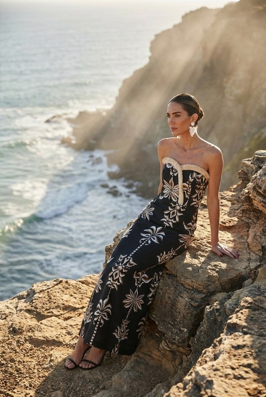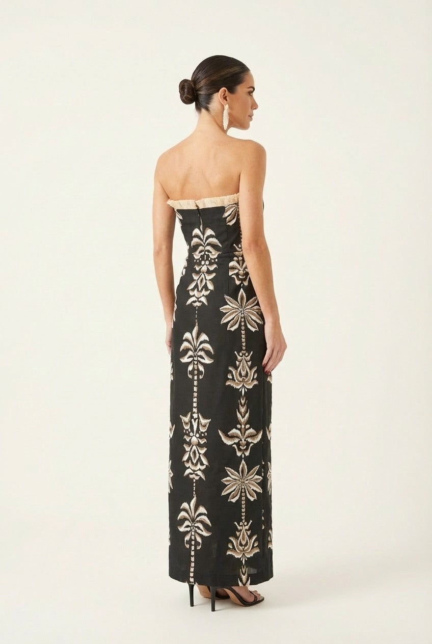 Striking, sculpted, and effortlessly refined—this strapless maxi dress blends bold print with timeless sophistication.