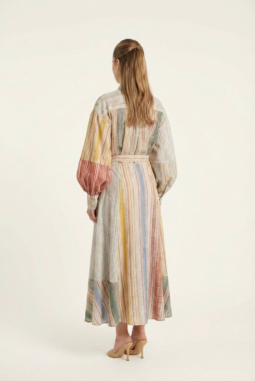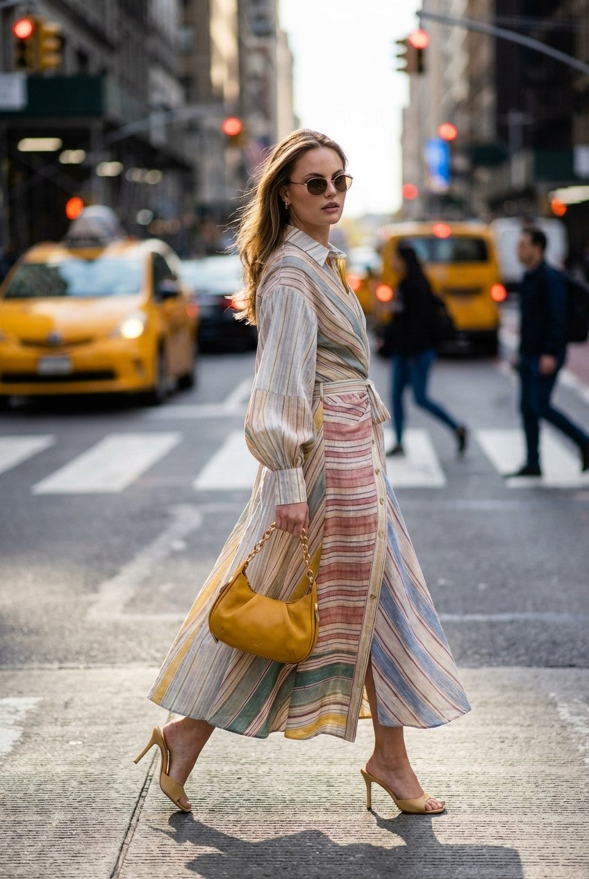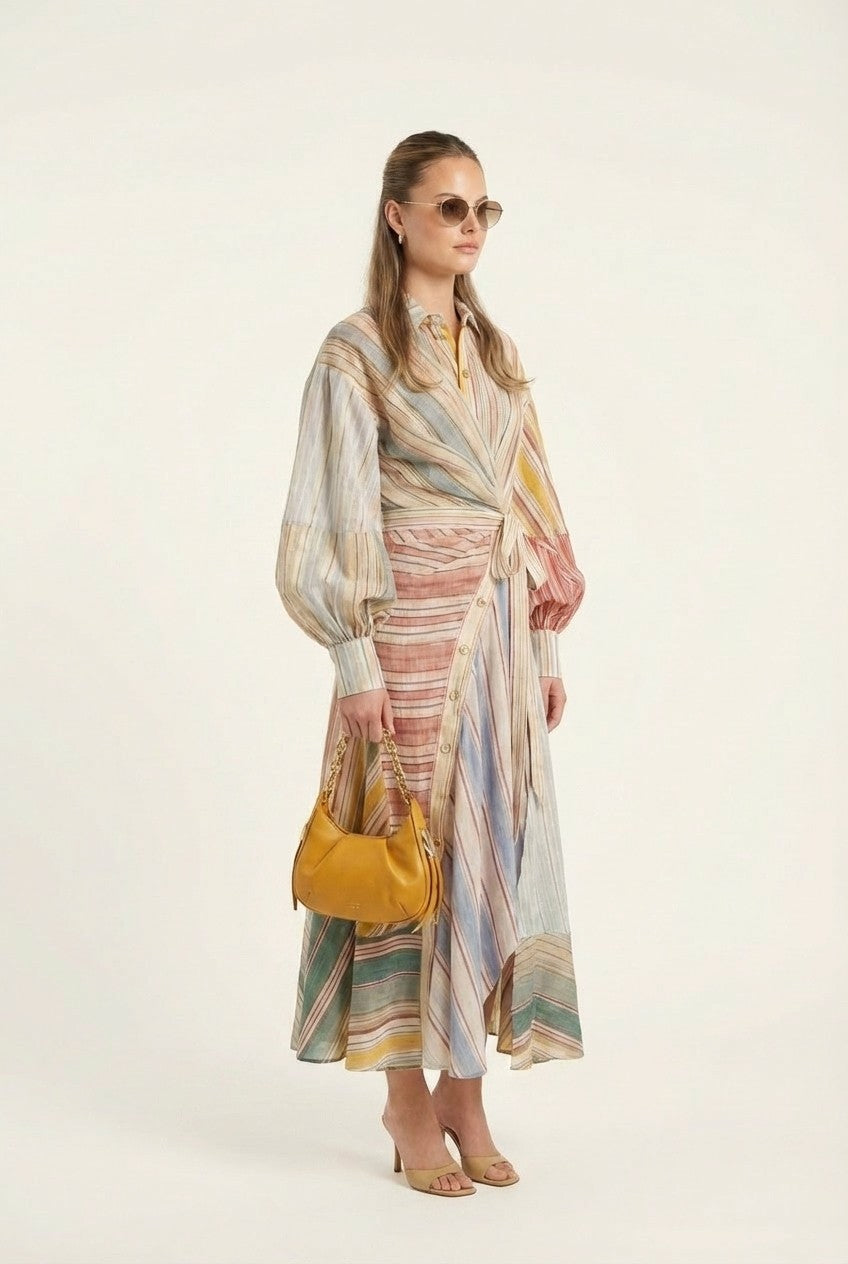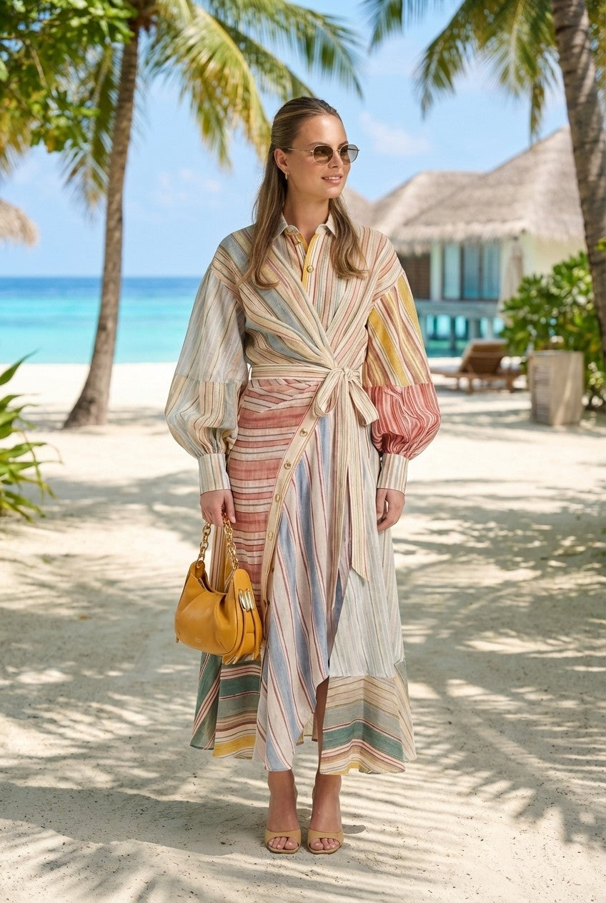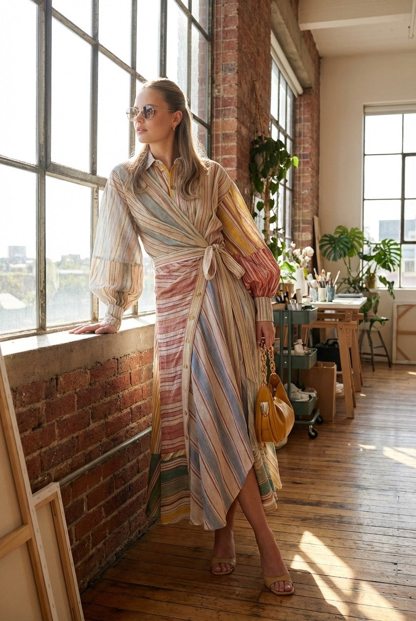 Effortlessly elegant with a modern twist, this dress features a flattering wrap-style waist and soft, flowing silhouette—perfect for both casual and elevated occasions.