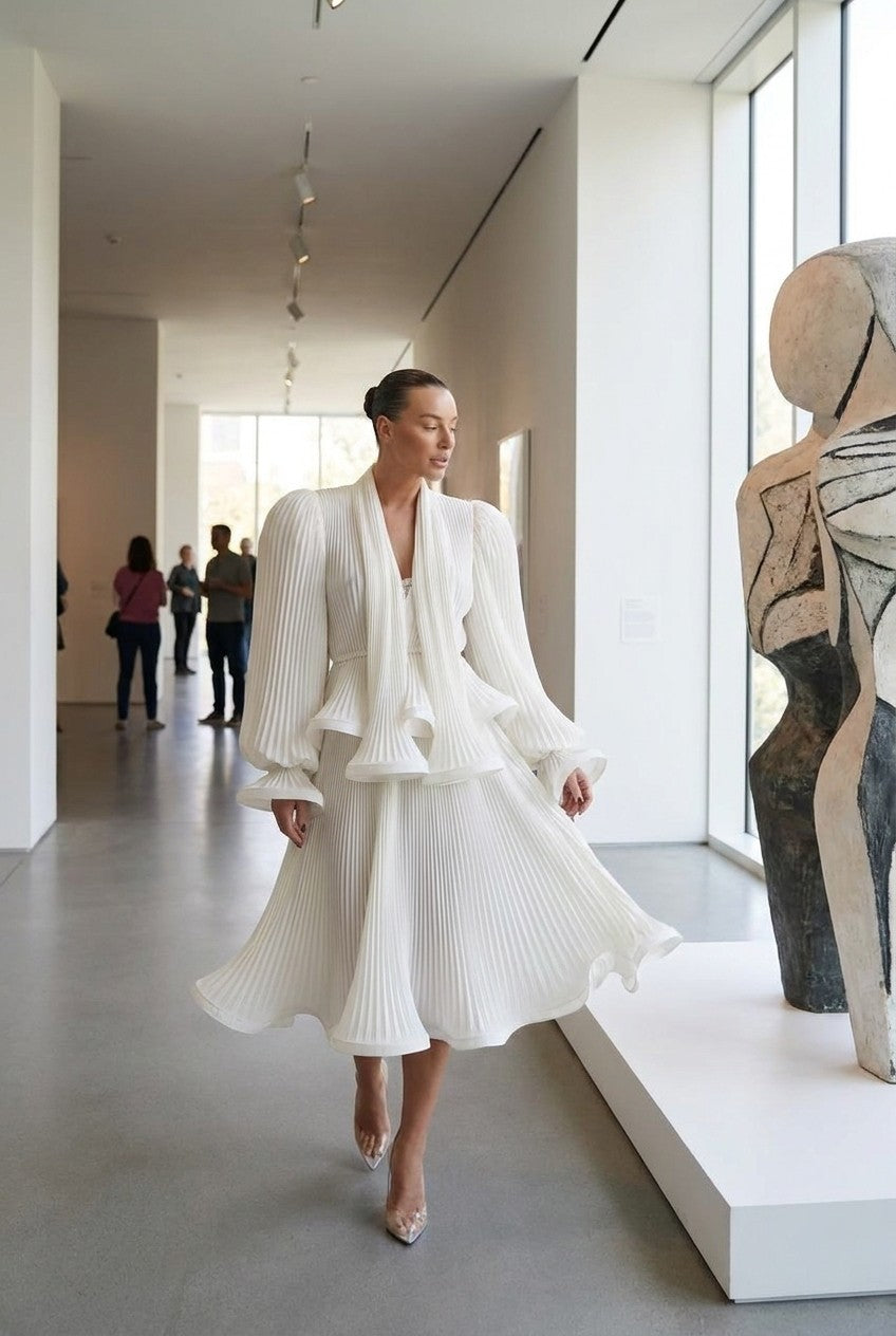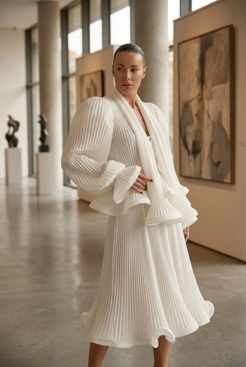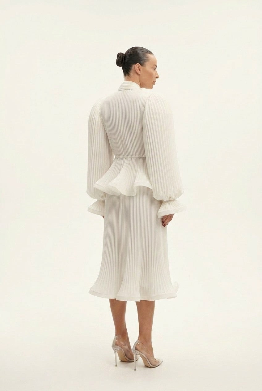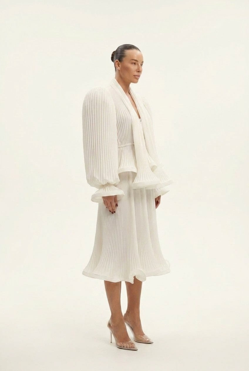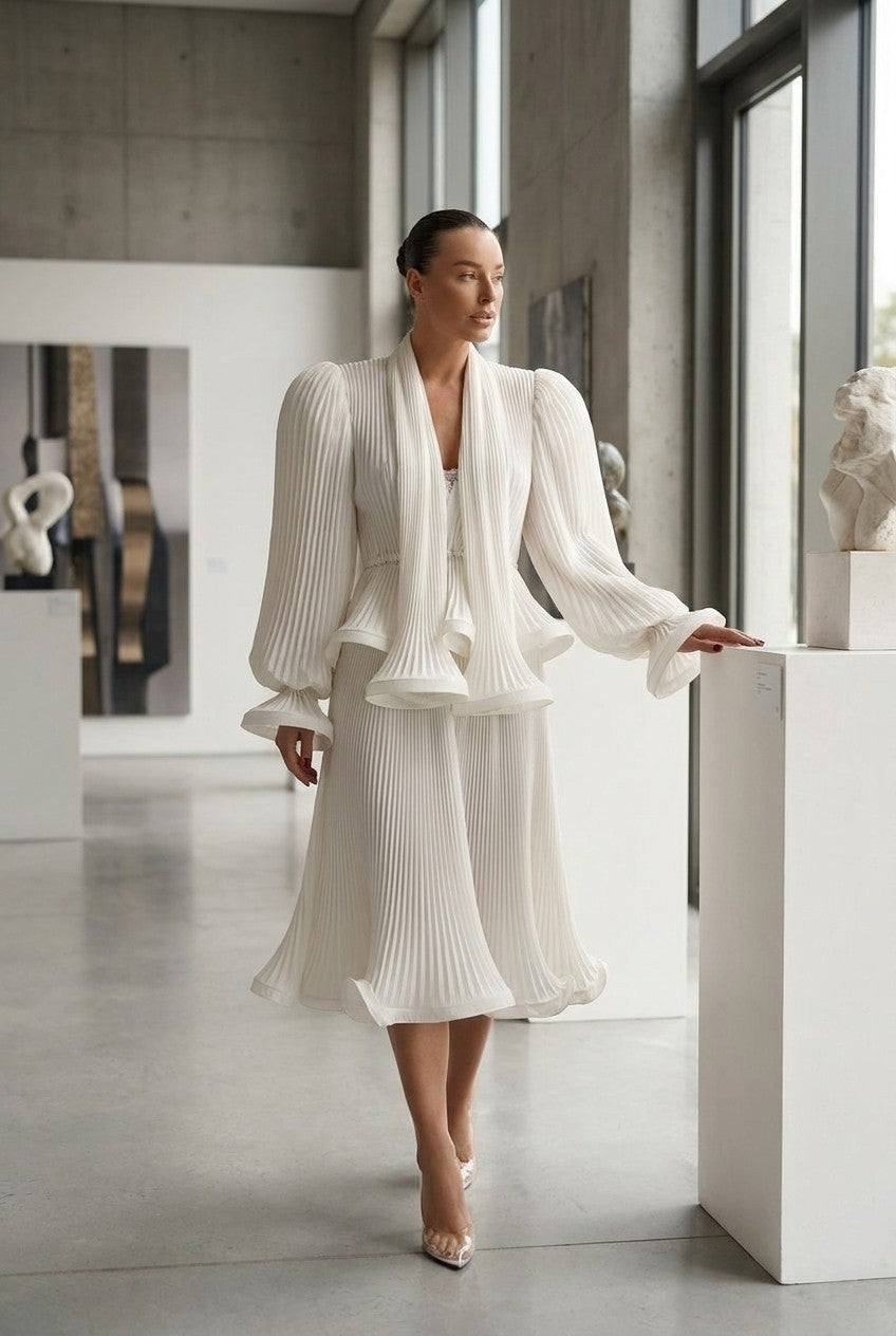 Women's White Pleated Midi Dress with Dramatic Puff Sleeves