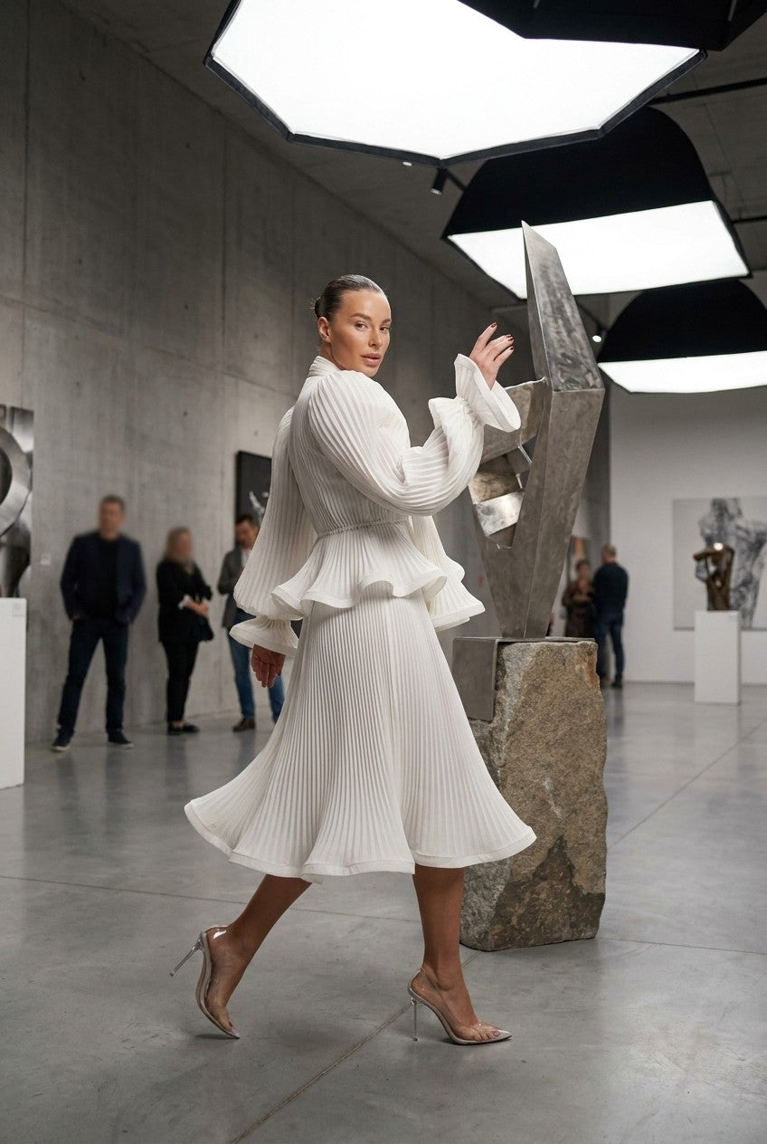 Pure architectural drama. This ethereal midi dress blends avant-garde structure with fluid movement, making it the ultimate statement piece for high-fashion events and gallery openings.