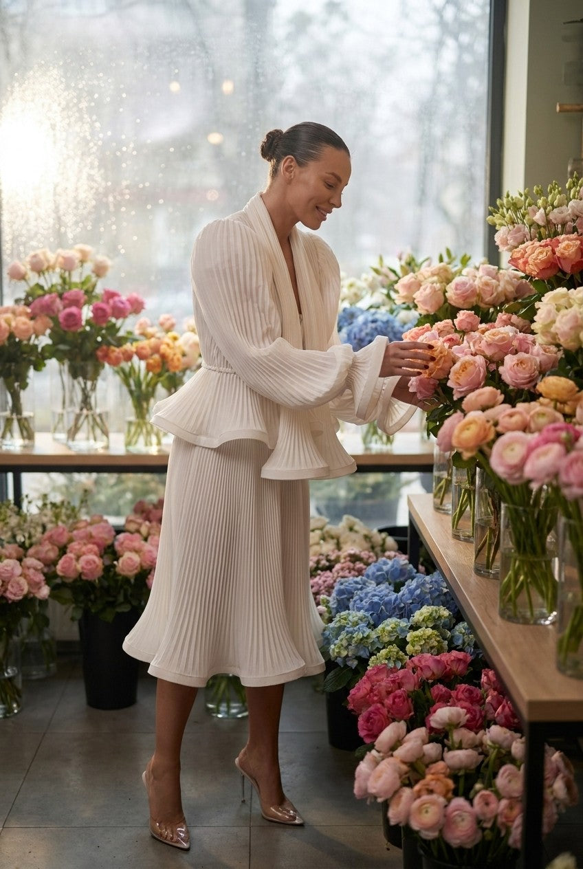 Textured Finish: The all-over micro-pleating adds sophisticated dimension while maintaining a lightweight, airy feel.